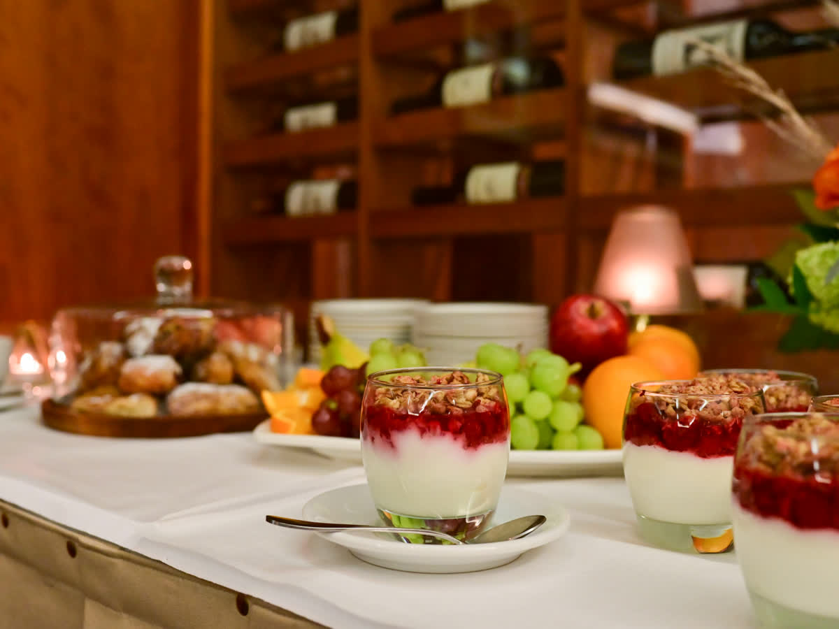 Our room was in a terrible location. We had to take the elevator to the 1st floor, and then climb two flights of stairs in a very dimly lit, dirty area. The room was not accessible by elevator. When we arrived the TV wasn't working (it was fixed) and the room was so hot, we had to request a fan. The evening meal was disappointing. I order steak on the stone, however it arrived on the plate. It was very chewy. Live music was advertised in the bar, starting at 9pm. We waited until 9:50pm and there was no band so we went to bed. The breakfast was fantastic. I would not stay in the hotel again.